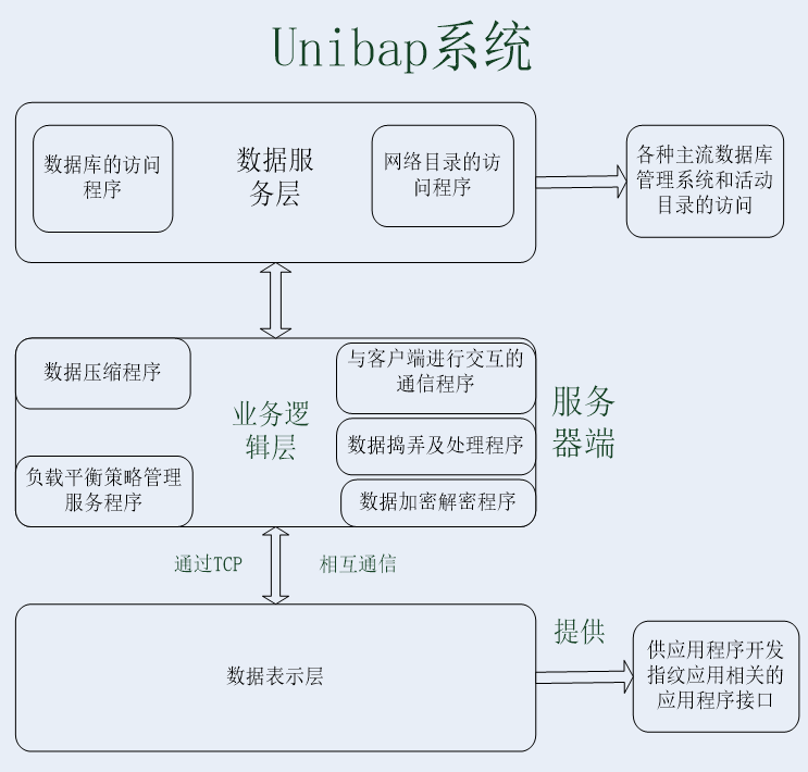 数据表示层提供供应用程序开发指纹应用相关的应用程序接口,并通过TCP与服务器端的业务逻辑层进行通信。(这里数据表示层也可封装成一个WEB SERVICE,供其它应用程序在INTERNET上调用,成为了其它应用程序的服务端。)