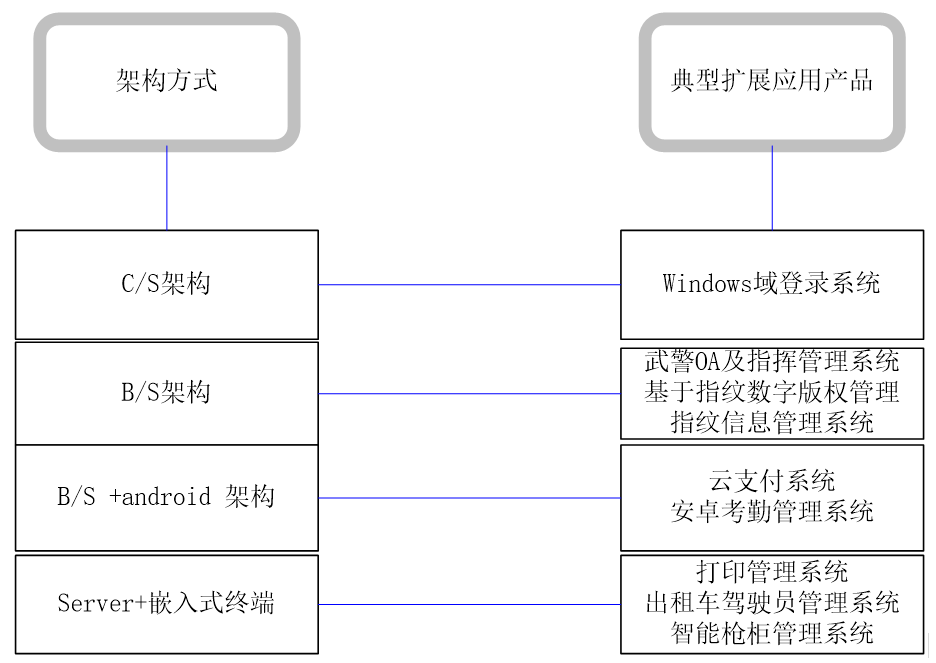本平台的架构几乎涵盖了目前软件系统的所有架构方式,它包括了Browser/Server、Browser/Server+移动终端、Client/Server、Server+嵌入式终端(含指纹UKEY模块)四种架构方式,其架构方式与对应的产品,如图下图所示: