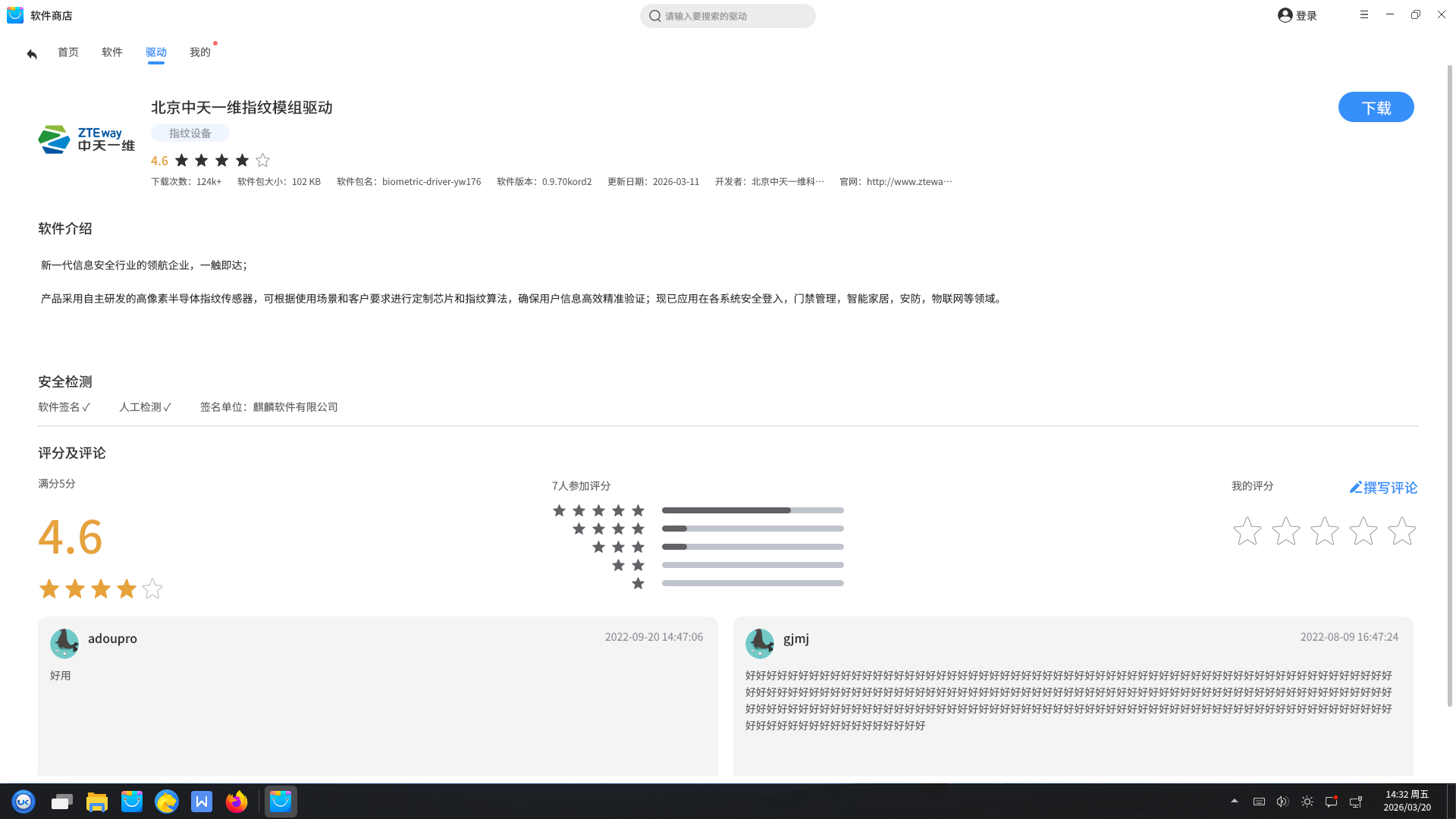 截至 2026 年 3 月,商店累计下载安装量突破 124,000 次,覆盖金融、能源、教育等多个关键行业,成为国产系统指纹认证领域的重要解决方案之一。