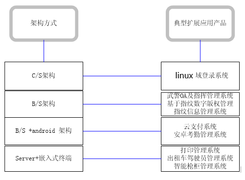 本平台的架构几乎涵盖了目前软件系统的所有架构方式,它包括了Browser/Server、Browser/Server+移动终端、Client/Server、Server+嵌入式终端(含指纹UKEY模块)四种架构方式,其架构方式与对应的产品,如图下图所示: