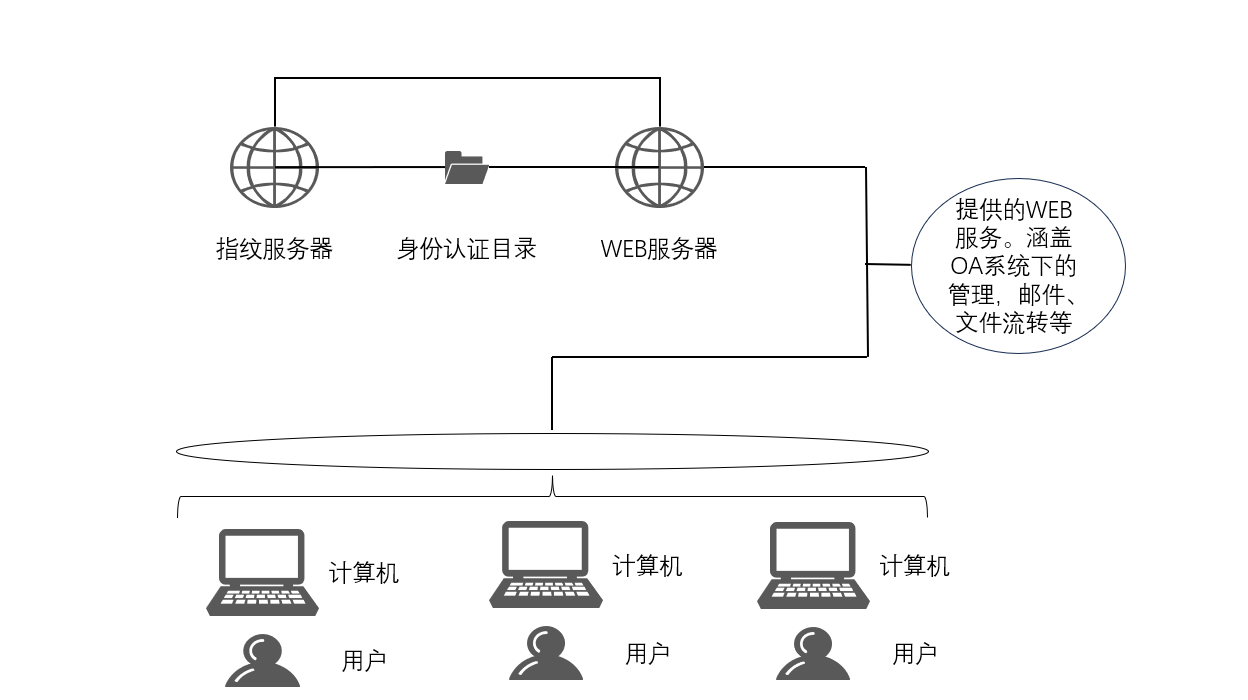 将指纹监测中间件集成到WEB服务器的门户站点,用户打开门户首页时,中间价监测用户通过指纹采集仪录入的指纹信息,并将指纹信息进行整理,通过网络传输到WEB服务器上,WEB服务器将得到的指纹信息向UNIBAP中记录用户指纹信息的数据库验证,同时在身份认证目录中查询用户权限,通过比对返回用户身份是否合法,WEB服务器根据比对结果决定用户能否进行相关的操作。